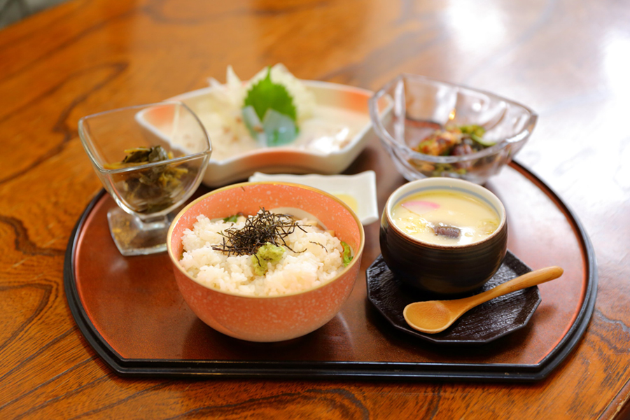 Lors de votre visite à Tsuwano, ne manquez pas de goûter au plat local « Uzume-meshi ». À première vue, cela ressemble à un simple bol de riz blanc avec du thé ou du bouillon (Ochazuke). Mais si vous y plongez vos baguettes, des ingrédients comme du tofu, des légumes et du poulet apparaissent de dessous le riz.
